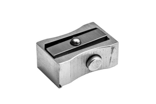 A sturdy, silver metal pencil sharpener, featuring a sharp blade for precise pencil points, presented on a dark transparent background. background removed