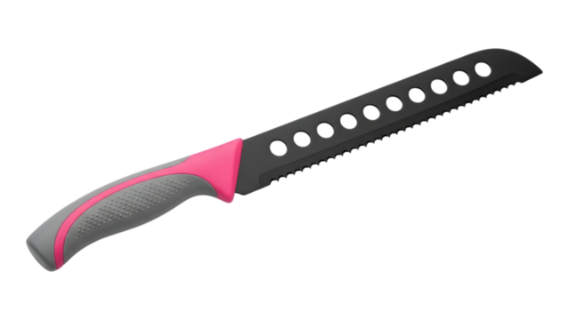 Kitchen bread knife with black serrated blade isolated on transparent background
