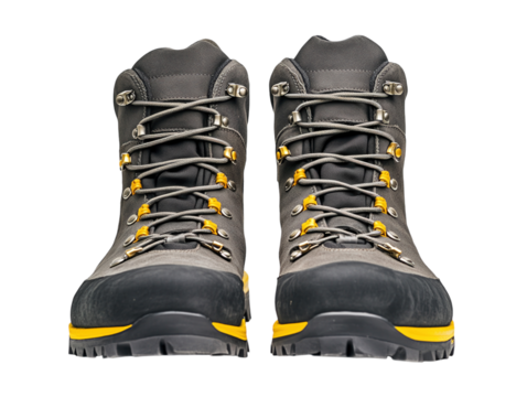 Grey and yellow hiking boots with rugged soles for outdoor adventures, isolated on white background PNG transparent.