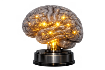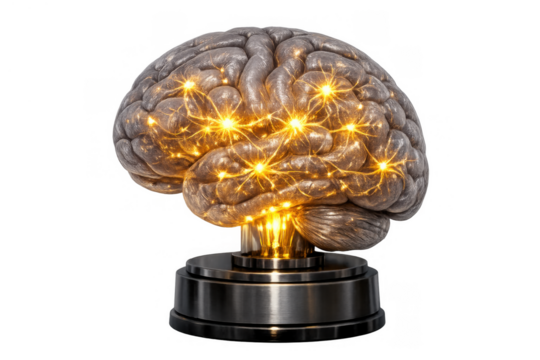 Brain glowing network concept on trophy base symbolizing mental power, artificial intelligence, innovation, and wisdom achievement