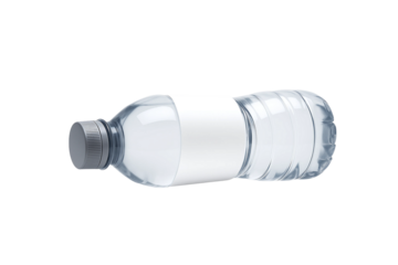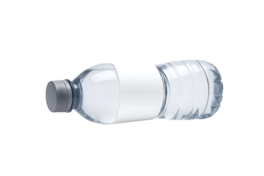 Plastic water bottle with grey cap and blank label lying horizontally on white background