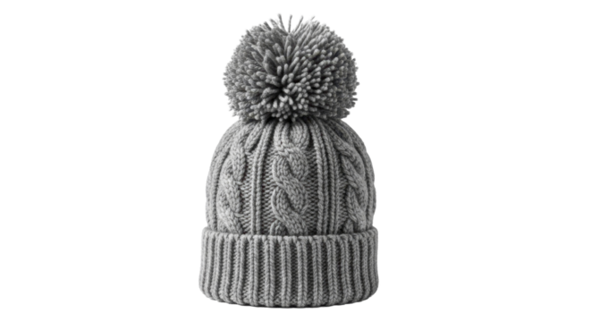 Cozy grey knitted winter hat with a festive pompom, cable knit texture, on a transparent background, PNG image, PNG file