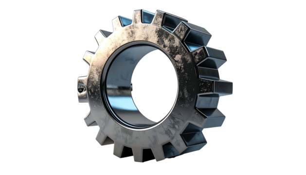 Metal gear wheel isolated PNG on transparent background, cogwheel component for mechanical engineering and industrial design
