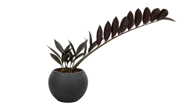 An elegant black leaf Zamioculcas zamiifolia, a popular low-maintenance indoor plant, potted in a modern grey container isolated on a white background
