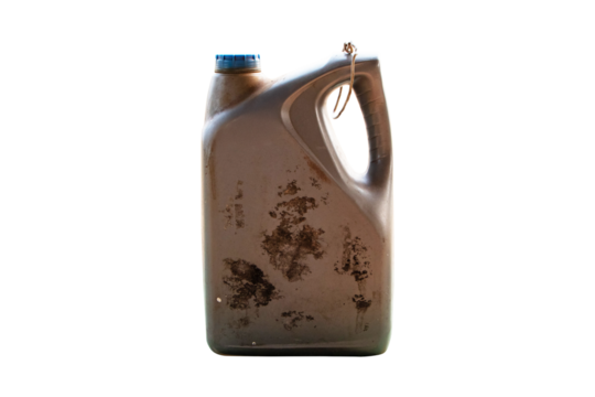 Old plastic gallon of engine oil grey container with green cover. Used dirty plastic cans for fuel storage. Isolated on cutout PNG or transparent background.