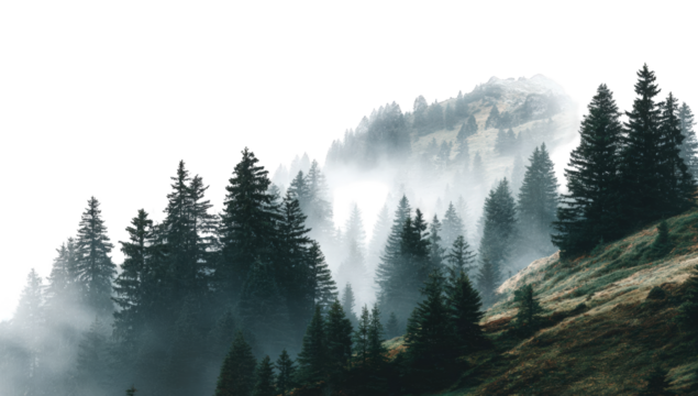 Dark pine forest landscape with fog and mist isolated on a transparent background