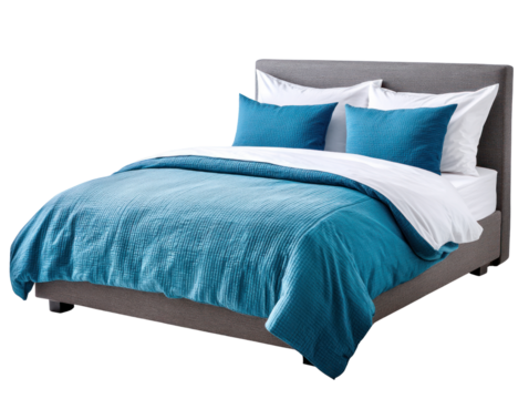 A neatly made bed with a textured teal duvet and blue pillows on a grey frame isolated on transparent background. PNG die-cut for advertising