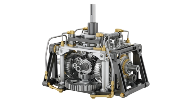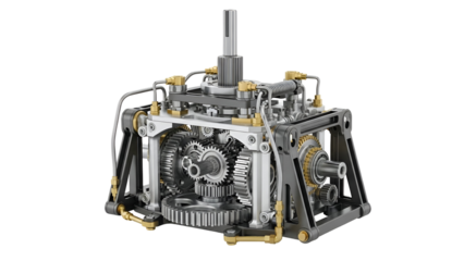 Three dark-grey gears interlocked, transparent background, symbolic of teamwork and mechanics. background removed