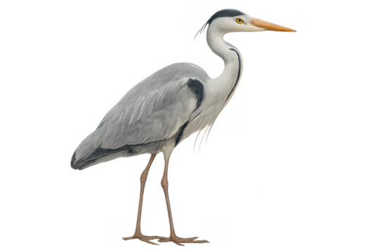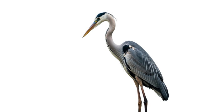 Isolated Great Blue Heron standing, a grey bird with a long neck and beak, wildlife