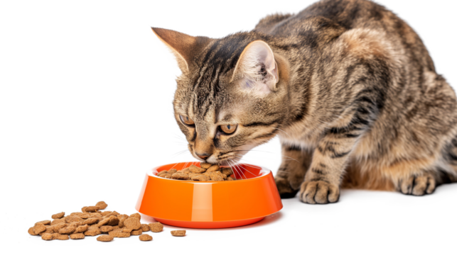Cat sits on the Windowsill and eats Dry Food. Tabby Kitten eating from an orange Bowl isolated on a transparent background