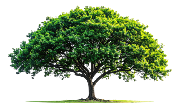 Large isolated tree with full, green canopy, grey trunk, and branches against transparent background
