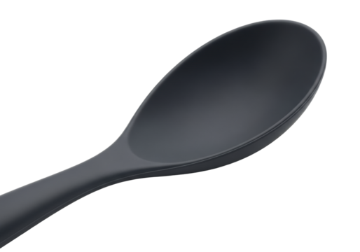 Deep charcoal grey silicone serving spoon with ergonomic handle and oval scoop, isolated against transparent background with copy space, clean studio lighting, modern culinary tools concept
