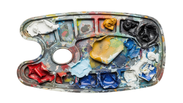 An old artist's palette with dried colorful paints, cut out, stock png, isolated on transparent background