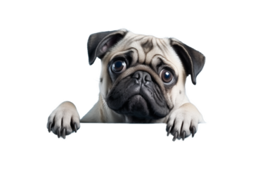 Cute pug dog with big expressive eyes looking curiously from behind a ledge. Ideal for pet care and animal-related projects.