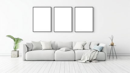 Living room interior design inspiration with empty poster frames on grey walls and a comfortable grey sofa