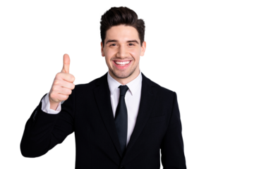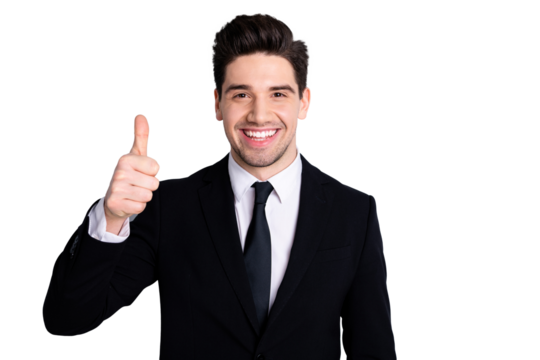 Close up photo amazing toothy he him his macho handsome hand arm thumb up advising buy buyer new tested product wear white shirt black suit jacket tie formal-wear isolated bright grey background