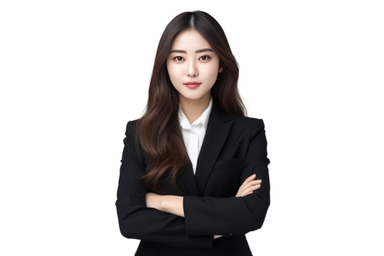 cute asian business woman in black suit and cross arms on transparent background