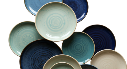 A beautiful assortment of artisan ceramic dinnerware, featuring rustic plates and bowls with a spiral glaze in earthy blue and green tones
