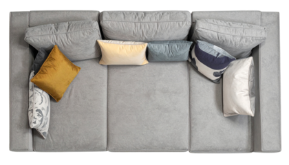Overhead view of a large, grey sectional sofa with various colorful throw pillows, creating a cozy living space