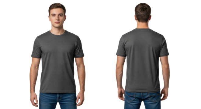Generic young adult male in blank charcoal grey t-shirt and blue jeans, front and back views, isolated on plain white background with ample copy space, apparel mockup concept
