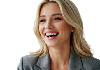 Transparent background blonde businesswoman smiling in grey suit