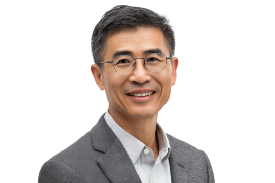 A set of natural professional headshots of middle-aged Asian businessmen with glasses and tailored grey suits smiling in a clean modern aesthetic isolated on a transparent background