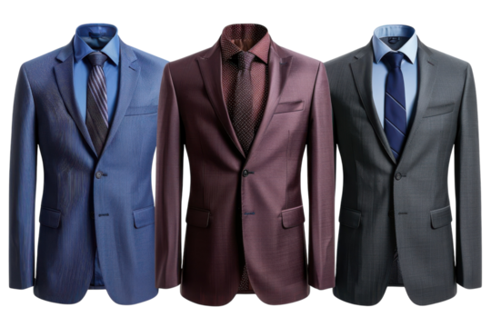 Elegant men's suits displayed together, showcasing a range of styles and colors for formal occasions and business meetings isolated on transparent background