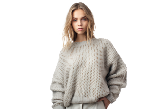 Sad woman in knit sweater with transparent background