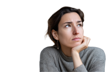 Thoughtful young woman in grey sweater looking upward pensive portrait against art face eyes hair girl on transparent background