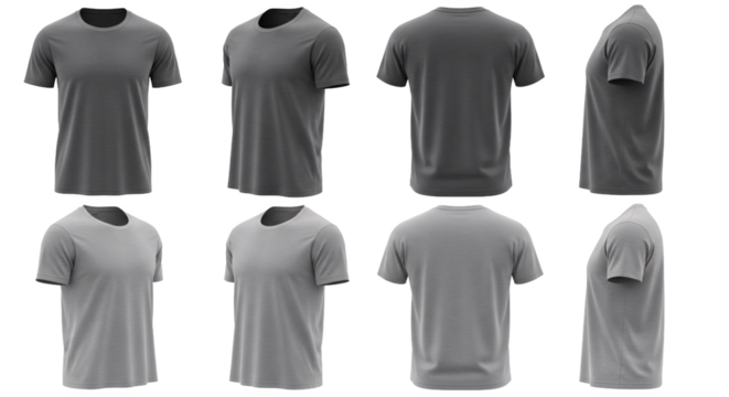 Collection of realistic 3d rendered grey t shirts displayed from multiple angles on a transparent background isolated on transparent background