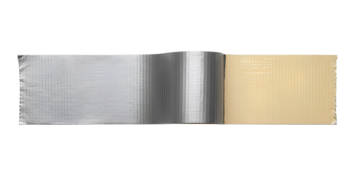 Gray duct tape piece with unfolded adhesive and fabric side isolated on transparent background. Silver metal surface. Sticky yellow part. Template mockup for message, labels, add text, design elements