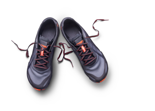 A top view of grey and orange trainers, sneakers Isolated on a flat background.