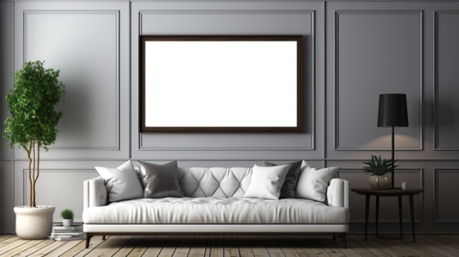 Transparent blank canvas frames on brick wall interior