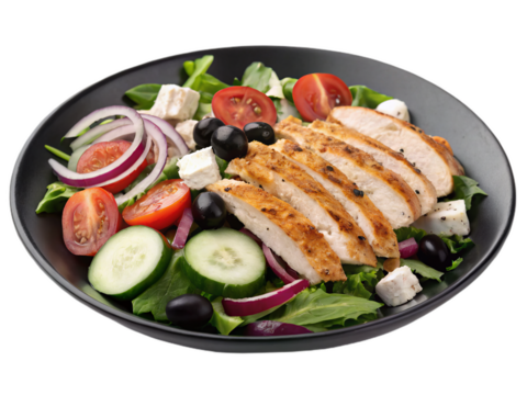 Sliced of grilled chicken, arranged neatly beside a fresh vegetable salad (crisp cucumber slices, juicy cherry tomatoes, thinly sliced red onions), plump black olives and creamy feta cheese in plate
