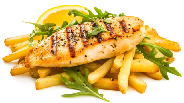 A grilled chicken breast with a side of french fries and a wedge of lemon