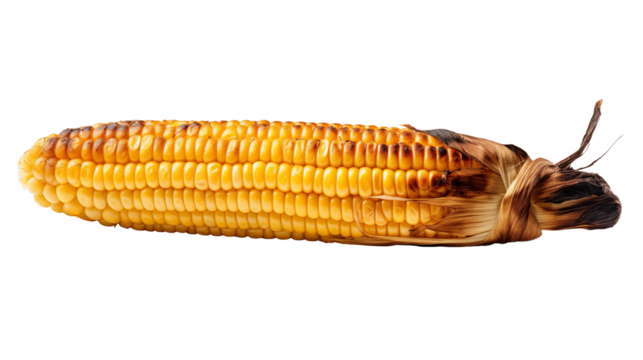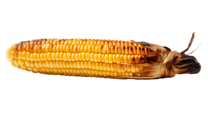 Grilled corn on the cob shows a warm, delicious treat with slight charring and husk isolated on transparent background