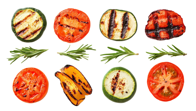 Set of grilled vegetables with herbs, isolated on transparent cutout background
