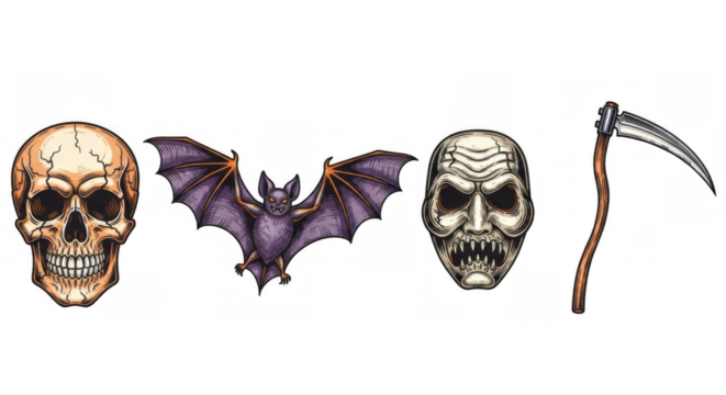 Halloween Icons Skull Bat Scary Mask and Grim Reaper Scythe.