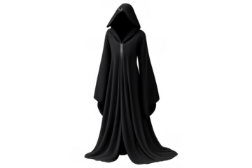 Black hooded robe, full length, with zip detail, representing mystery, death, and fantasy themes. Transparent background