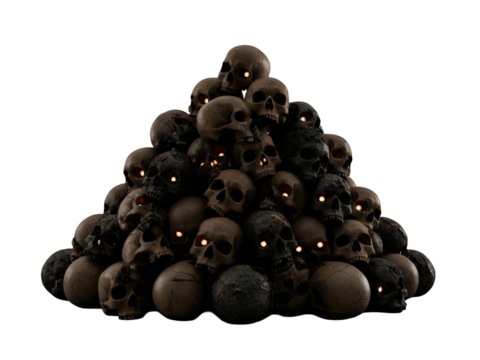 Pile of Dark Human Skulls with Glowing Eyes, Horror Concept Isolated on Transparent Background Isola