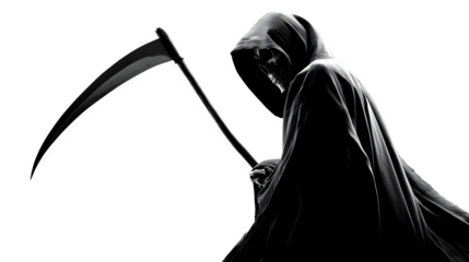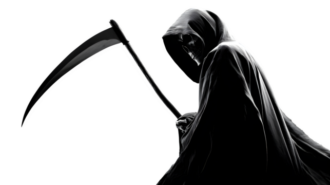 Grim Reaper with scythe cloaked in shadow, isolated on white background