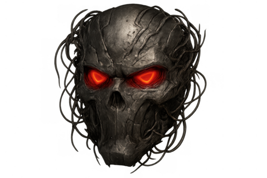 Dark metal skull with glowing red eyes and tangled wires on transparent background, representing fear, evil, and power