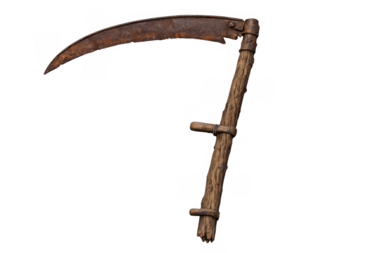 Rusty scythe with wooden handle isolated on transparent background symbolizing death grim reaper harvest agriculture