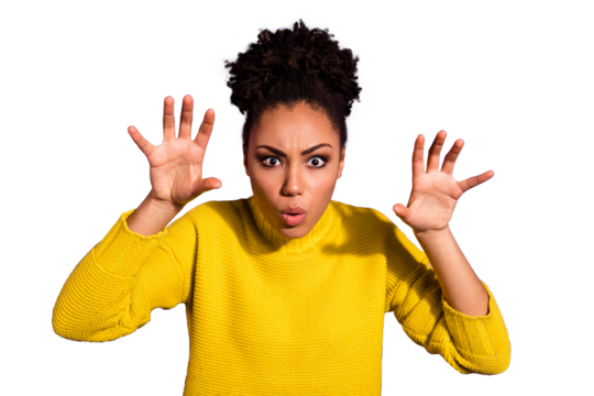 Close up portrait of shocked concerned young woman with dark skin and curly hair, hears terrifying news, keeps hands on cheeks, wears spectacles and white sweater, isolated on grey background