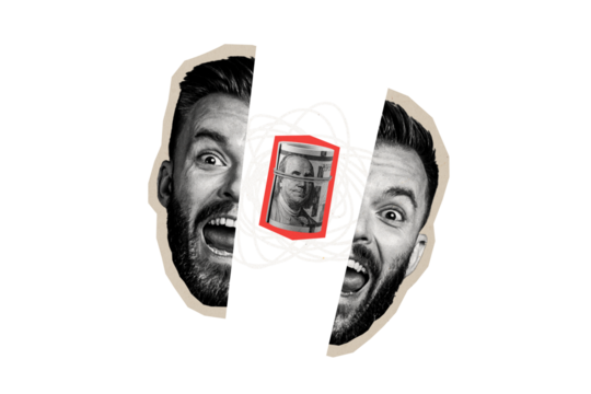 Composite trend artwork sketch image photo collage of young man divided half sad face headache tired scream line money profit roll dollar