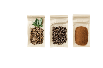 Top view of light roast, dark roast, and ground coffee in kraft paper bags, ideal for packaging design, cafe branding, coffee blog visuals, or ecommerce mockups. Clean layout with copy space.
