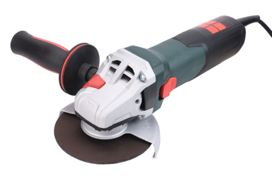 Angle grinder with a disc for cutting stainless steel metal on a white background.