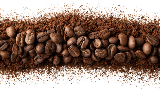 Closeup of roasted coffee beans and ground coffee isolated on transparent background