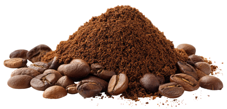 Flying coffee beans and coffee grounds scattered in the air isolated on a transparent background