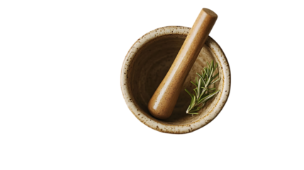 A wooden mortar and pestle with a sprig of rosemary for culinary use.